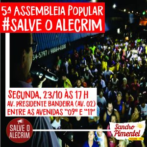 Os trabalhadores informais do Alecrim seguem na luta contra ação da Prefeitura que pode retirar os comerciantes do bairro. Na próxima segunda, 23/10, a partir das 17h, os trabalhadores voltam a se reunir na avenida Presidente Bandeira para a 5° assembleia popular. Nessa assembleia, os trabalhadores receberão informes sobre a reunião de negociação com a Prefeitura, que acontecerá no mesmo dia, às 14h, na SEMSUR. Assim, é fundamental a presença dos trabalhadores e trabalhadoras e de todos que apoiam a preservação do bairro histórico. Participe!